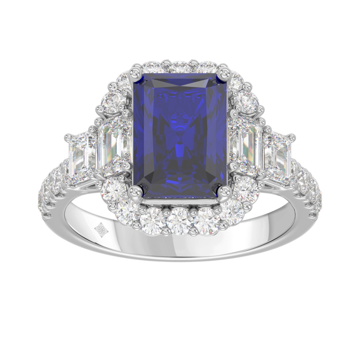 14K WHITE GOLD 4 1/2CT ROUND/EMERALD DIAMOND LADIES RING (CENTER STONE EMERALD BLUE SAPPHIRE DIAMOND 3CT)